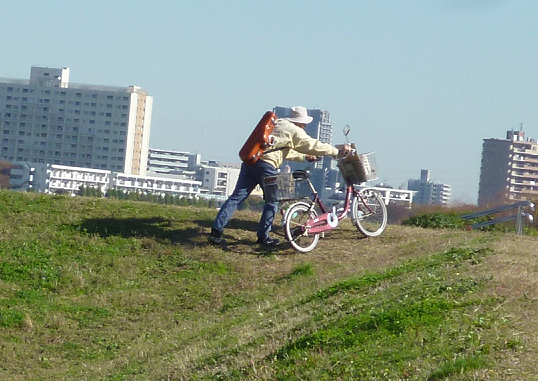 今日は出遅れ散歩で、ブラブラ川の方に行ってみたら、丁度帰っていくサックスおじさんが・・・