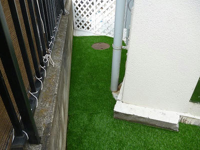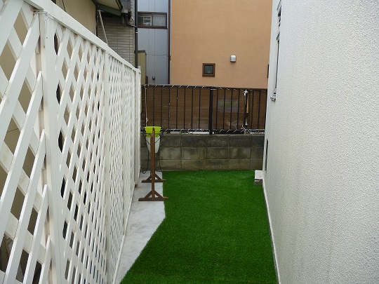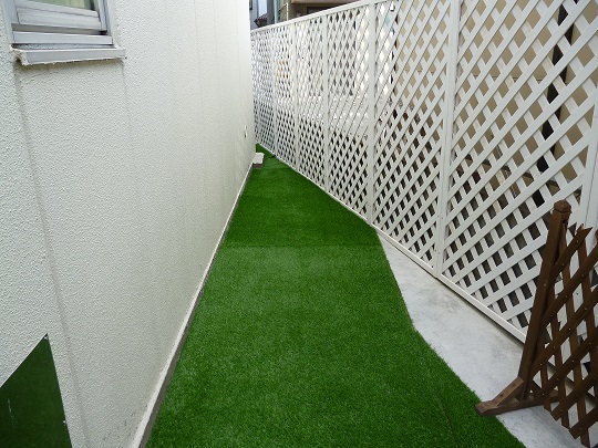 最後、人工芝の斜め切りの余った部分で埋められるかなぁ?と思っていたら、両面テープも終わってしまい完璧に敷き詰めることできなかったけど、とりあえず真ん中歩くだろうし、端は隣の駐車場の物置があり多少日陰になるし大丈夫かな~?と。